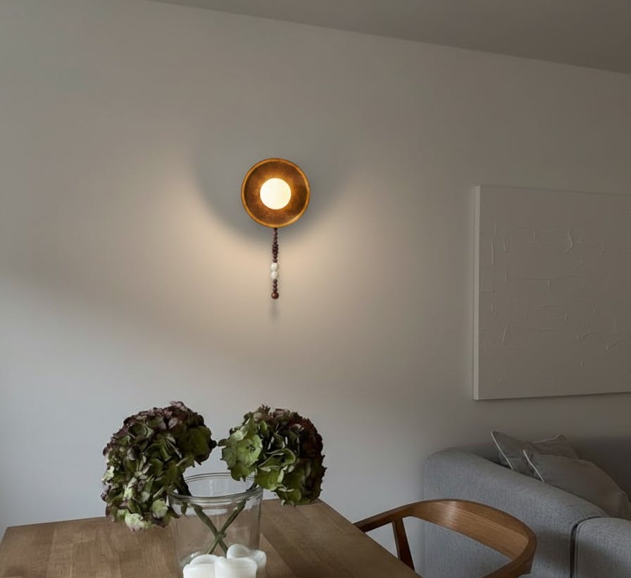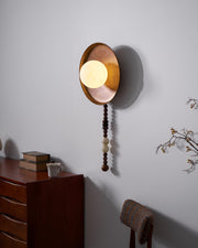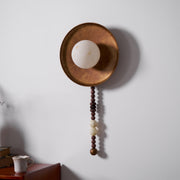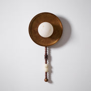 The Eldertide wall lamp blends rustic materials and old-world design to create an ancient and mysterious ambience. The glass shade is surrounded by a weathered bronze disk, reminiscent of an artifact from a distant era. The natural gemstone beaded chain adds to its timeless, handcrafted charm. Perfect for creating a moody, vintage vibe, this wall lamp brings a sense of history and mystery to any room.
