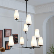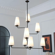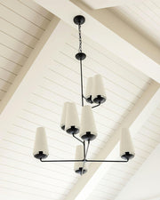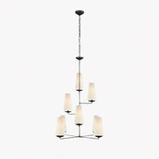 Fontaine vertical's playful forms add dimension and movement to the space. The unique design features eight linen lampshades hanging from a layered copper frame, making it visually interesting yet balanced from every angle.