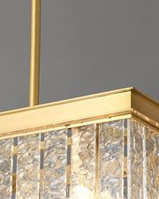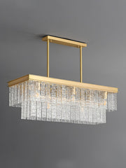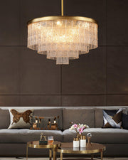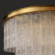 The Giovanni Grande Chandelier is a midcentury marvel. It features K9 glass with a textured finish, creating a beautiful, diffused light. Its solid brass frame and linear architectural tiers make it a striking addition to any home decor.