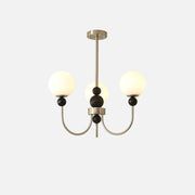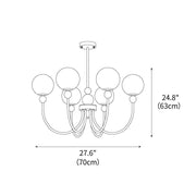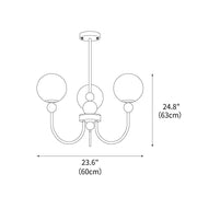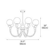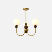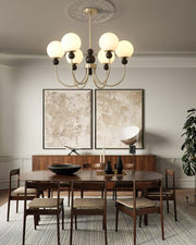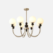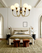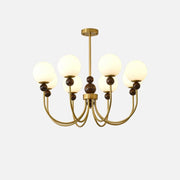 The Gold Globe Chandelier elegantly combines warm golden tones with rich wood accents, capturing the essence of mid-century modern design. Each of the frosted glass globes is carefully placed on a gently curved arm, creating a harmonious balance of light and shape.