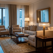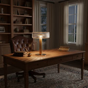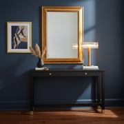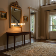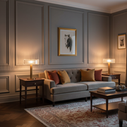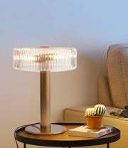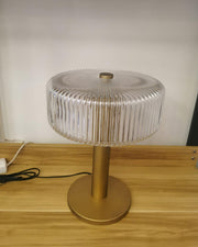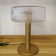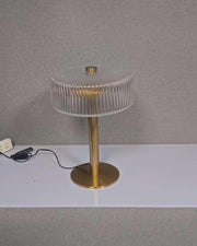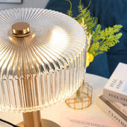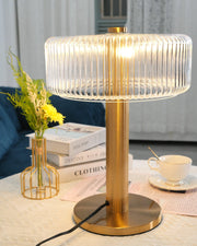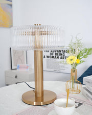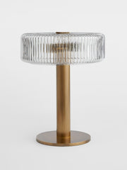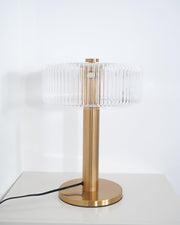 Influenced by the glamour of traditional American interiors, the Renato table lamp features a fluted column with an gold finish. The ribbed, faceted glass shade casts distinctive light patterns and shadows across the room. Look for similar styles in our North American Houses, including Brooklyn's DUMBO House.