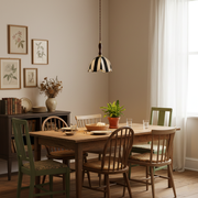Stripe Tulip Pendant brings a touch of classic charm and playful style to any space. Its tulip-inspired shape and bold black-and-white vertical stripes evoke a vintage, Art Deco feel, while the warm wood-accented top adds an element of rustic elegance. This pendant light is perfect for hanging over small dining tables, reading nooks, or as an accent in eclectic interiors. The unique striped fabric shade creates a soft, ambient glow, adding warmth and character to your home.