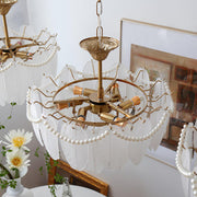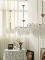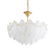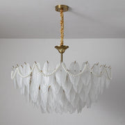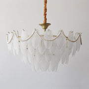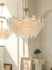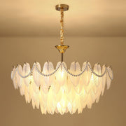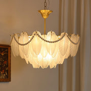 Make a bold statement with this Texture Glass Leaf Chandelier. Its unique feather shape and wrought iron lines and circles offer style and depth, while the leaves texture glass lampshade provides non-glaring light. Perfect for any daring space!