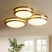 Bring home the Whittier Natural Brass Flush Ceiling Light for aesthetic lighting in your entryway, living room, or bedroom. Featuring a cylindrical white glass shade, this ceiling light is designed to impart soft lighting to accentuate your space. The fixture is built from premium brass for long-lasting durability. The brass rim and vertical brass rods offer enhanced support to the light diffuser.